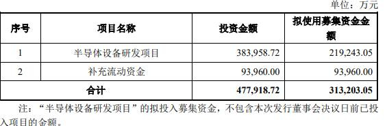 公司本次向特定对象发行股票募集资金总额不超过313,203.05万元(含本数),发行的募集资金在扣除发行费用后,将用于半导体设备研发项目、补充流动资金。