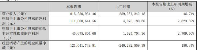 据公司2025年一季报,报告期内,公司实现营业收入8.15亿元,同比增长45.74%;归属于上市公司股东的净利润1.11亿元,同比增长2623.82%;扣除非经常性损益后的净利润4567.58万元,同比增长2709.60%;经营活动产生的现金流量净额-1.21亿元,同比增长150.37%。